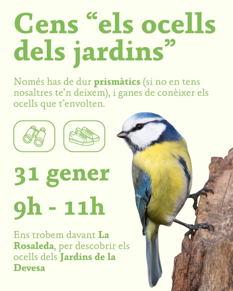 El proper 31 de gener, et convidem a descobrir els ocells que viuen als Jardins de la Devesa. Una activitat gratuita, oberta a tothom i ideal per començar a mirar la natura amb uns altres ulls i aprendre sobre ocells. Saps el que és un cens? Vine a descobrir-ho!