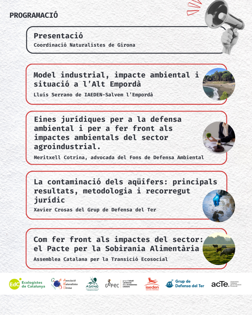 Durant la sessió s’abordaran qüestions com la contaminació dels aqüífers, els efectes ambientals de la ramaderia intensiva —amb especial atenció a la situació a l’Alt Empordà— i les eines jurídiques per defensar el medi ambient i la salut pública. També es compartiran experiències i iniciatives que treballen per avançar cap a models agraris més sostenibles.